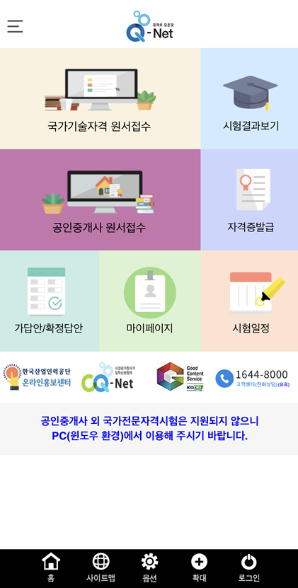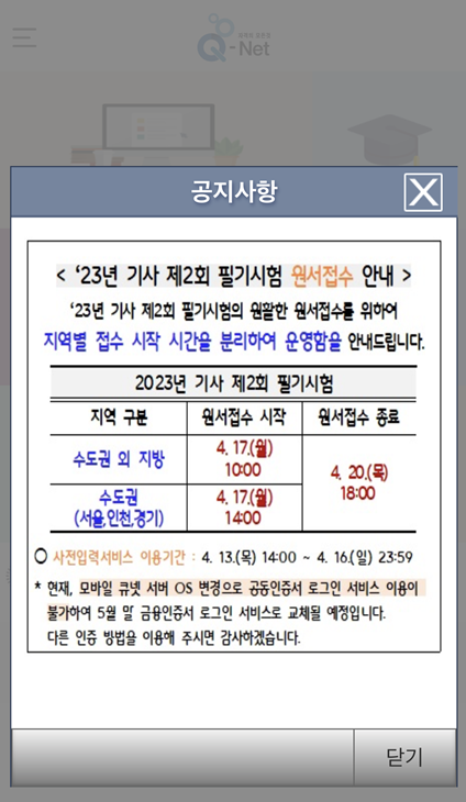 - 현재 모바일 큐넷 서버 OS 변경으로 공동인증서 로그인 서비스 이용이 불가하여 5월 말 금융인증서 로그인 서비스로 교체될 예정입니다. 다른 인증 방법을 이용해 주시면 감사하겠습니다.